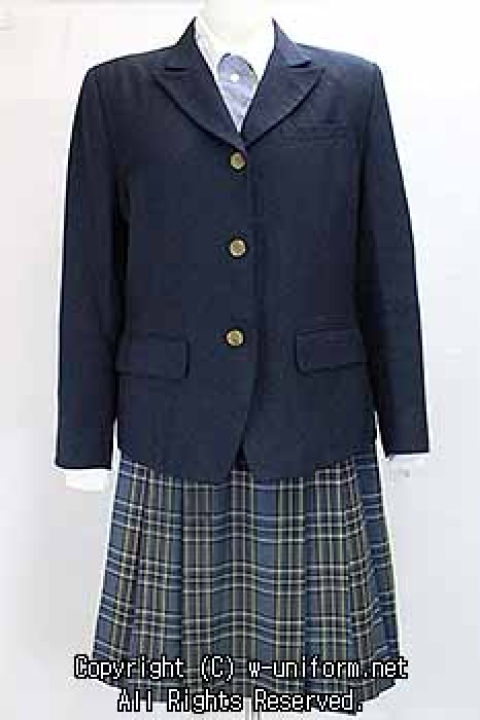 制服は、コシノヒロコデザインのオシャレな制服で、紺のシングルブレザーにチェックスカート、ネクタイ一体型のブラウスを組み合わせます。