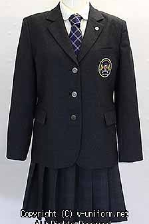 制服は、チャコールグレーの3つボタンのシングルブレザーにチェックスカートの組み合わせで、胸元にはチェック柄のネクタイを付けます。ブレザー左胸には大きなエンブレムが映えます。