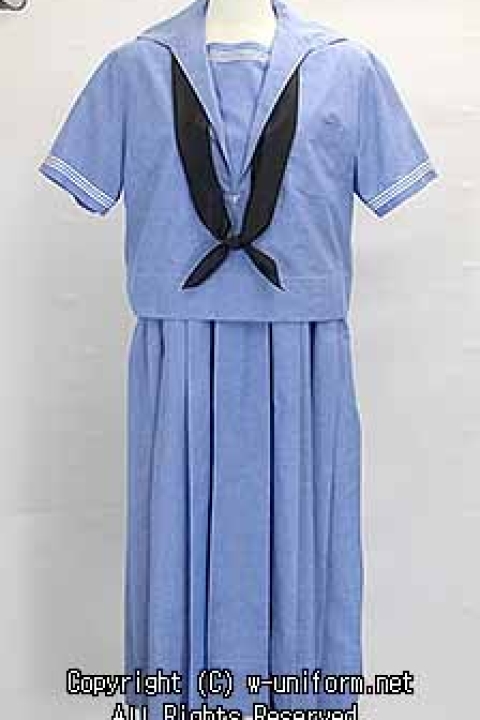 制服は、白の三本ラインの入った青地のセーラー服で、同色のジャンパースカートを組合せます。胸には黒のパータイを付けますが、その付け方が特徴的で、あえて胸元では結ばずにゆったりと垂れ下がるように縦に伸ばし、お腹のあたりで先端だけちょこっと小さく手結びにします。その他、セーラー服の襟が背面に垂れ下がっていないのも大変特徴的です。また、この伝統ある制服は、大正15年の開校以来、85年間ほぼ現在の制服とデザインは変わっていないそうです。