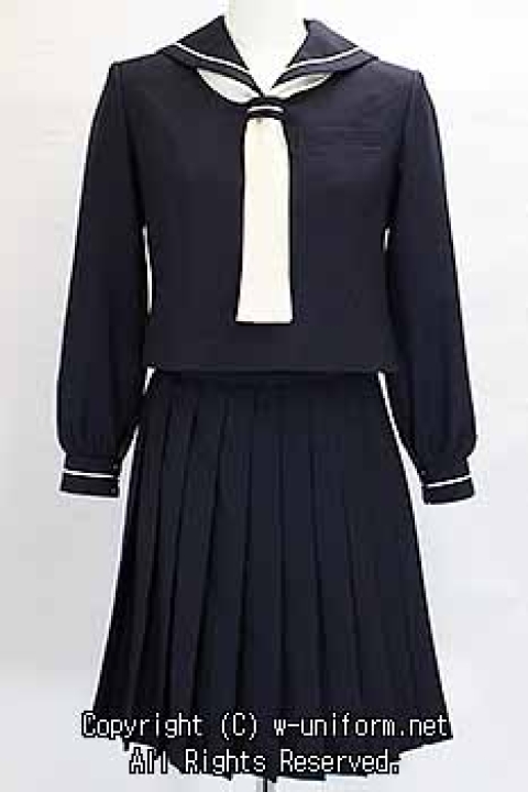 旧制服は、OLIVE des OLIVE製です。旧冬服はアイボリー色の1本ラインの入った黒に近い濃紺のセーラー服で、胸元にはアイボリー色のタイをタイ留めに通します。セーラーの襟背面は丸みを帯びた三角形が個性的で大変人気がありました。