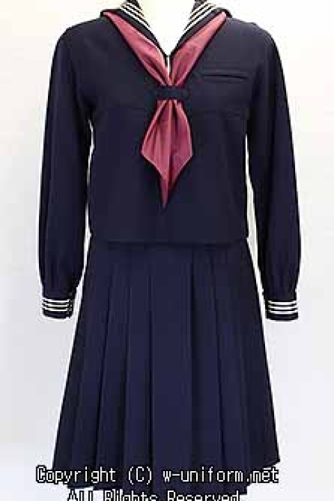 制服は、中高共に白の3本ラインが入った紺のセーラー服で、胸元にはスカーフを通します。また、スカーフは中学1年~高校3年まで6年間学年カラーがあり、全部で6色あります。こちらの制服にはエンジのスカーフが付いています。