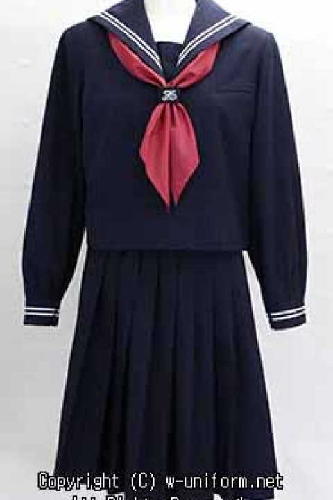 制服は、いままで買取ったハンパ物を組み合わせたセットで、白い3本ラインの入った紺のセーラー服に紺のプリーツスカートの組み合わせ、胸元には赤い新品のスカーフを結んでいます。また、セーラーの胸当てには刺繍が入っています。