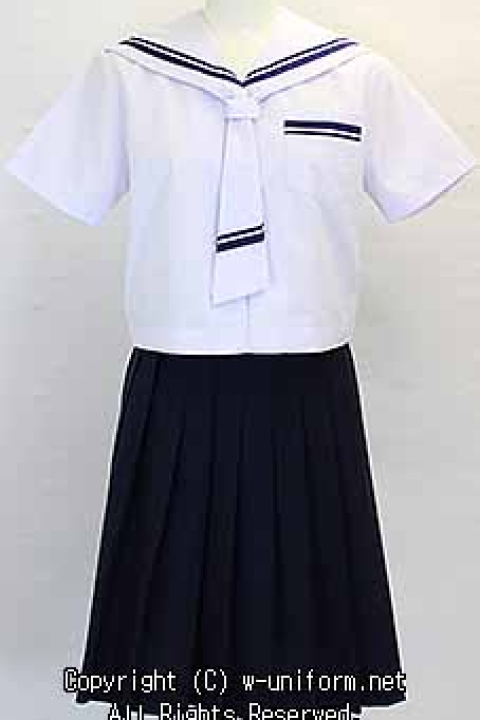 制服は、いままで買取ったハンパ物の制服を組み合わせたセットで、白い襟に太さの違った青い2本ラインの入ったセーラーで、胸元にはセーラー襟と一体化したタイを留めます。またタイと左胸ポケットにも太さの違う2本ラインが入っています。