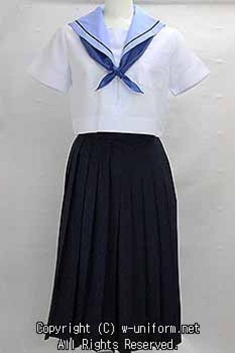 制服は、いままで買取ったハンパ物を組み合わせたセットで、水色の襟に紺色の1本ラインの入った白の横開きセーラー服に濃紺色のプリーツスカートを組み合わせ、胸元には紺色のスカーフを結んでいます。