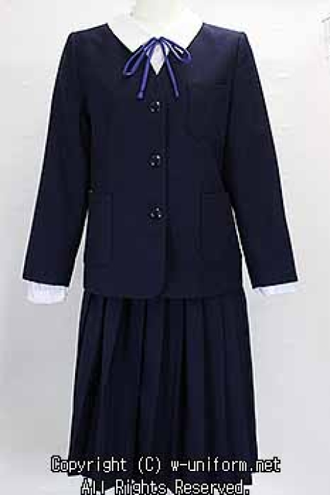 制服は、紺のイートンジャケットからブラウスの襟を出し、同色のスカートと組み合わせます。胸元には青いヒモタイを付けています。