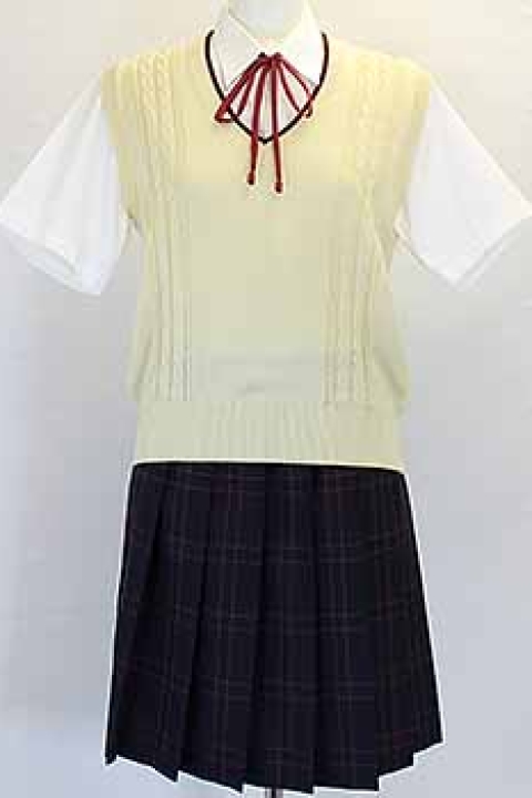 制服は、白い半袖ブラウスに胸周りに赤のラインが入ったアイボリーのニットベストと赤系のチェックスカートの組み合わせで、胸元には赤の新品ヒモタイを付けています。