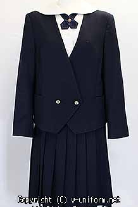 制服は、紺のダブルのブレザーに、同色のプリーツスカートの組合せで、胸元には特徴あるクロスしたチェック柄リボン(ボタンで取り外し可能)をつけます。ブラウスはセーラー風なのが特徴で、襟無しのブレザーからセーラーカラーを外に出します。夏もセーラー襟のオーバーブラウスとチェックスカートにクロスタイを胸元に付けます。