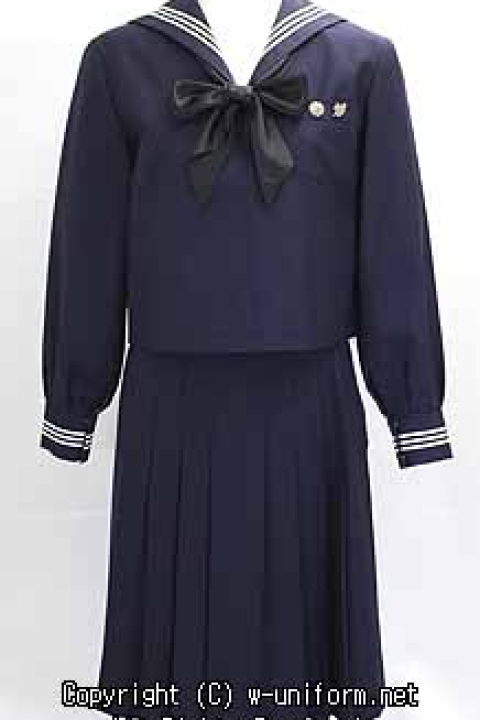 制服は、女学校の制服として日本で初めて制定されました。現在も中学、高校とも同じ伝統ある3本ラインの紺のセーラー服で、胸元には中学は赤のパータイ、高校は黒のパータイを結びます。また、極小人数しか持っていないレアな委員バッチも付属しています。