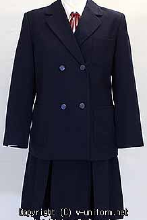 制服は、紺のダブルのブレザーに同色のボックススカートの組み合わせで、胸元には赤いヒモタイを付けます。同色のベストもあります。