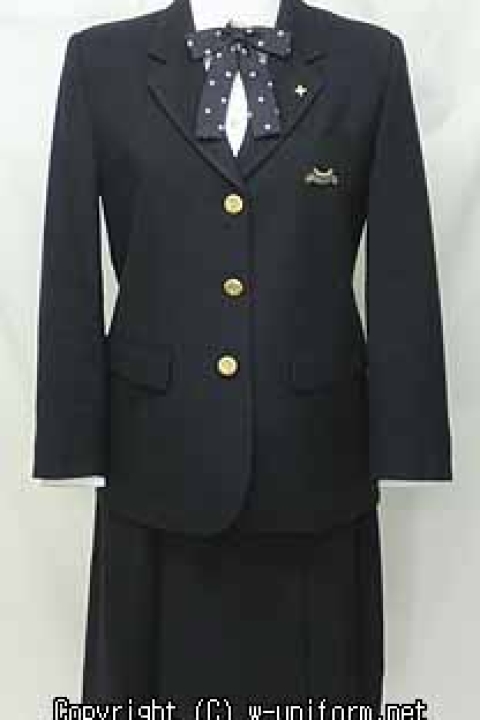 制服は、2001年度から男女共学になるのにともない、冬服のみ、セーラー服スタイルからシックな紺地のブレザースタイルに変更されました。こちらの制服は、変更後の新タイプとなります。新タイプの冬服は、紺色のシングルのブレザーに、同色のスカートの組合せで、胸元にはクレスト柄のリボンを付けます。また、中間期用として、ニットベスト・セーターも付属しています。
