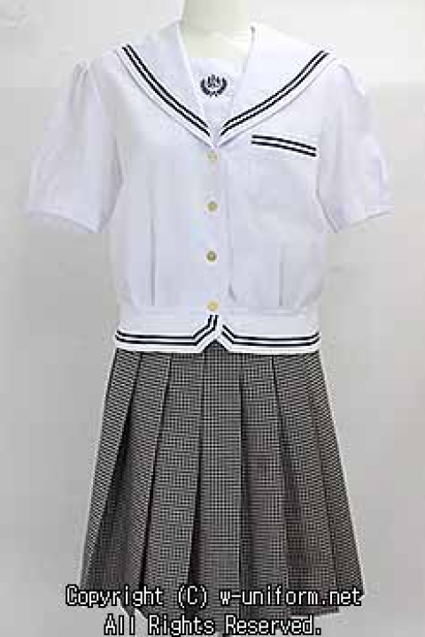 制服は、中学が2005年から、高校が2008年から新しいデザインになりました。こちらの制服は、それまで採用されていた旧型です。旧制服のデザインは、花井幸子氏によるもの。中高似たデザインですが、中学がセーラーブラウスにプリーツスカートで、高校がオーバーブラウスにボックススカートの組み合わせになります。(こちらの制服には森英恵さんのチェックスカートをお付けしています)