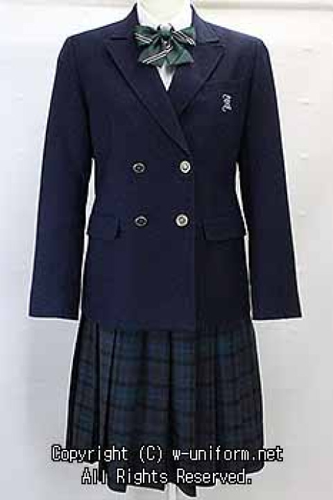冬服は、紺色のダブルブレザーに、緑色系のスカートを組み合わせ、胸元には緑色のストライプ柄リボンを付けます。またブレザーの左胸には刺繍が入っています。