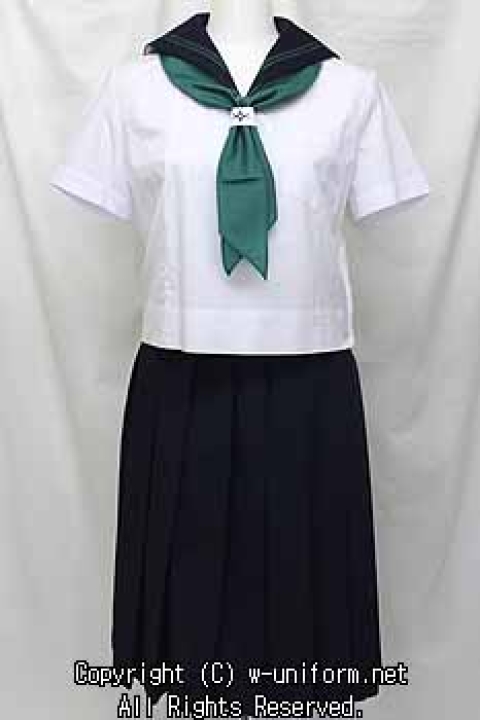 制服は、グリーンの2本ラインが入ったセーラー服で、セーラーカラー背面の両サイドにある刺繍が大変特徴的です。また、胸にはグリーンのスカーフを留めます。スカーフ留めにも刺繍が入っています。