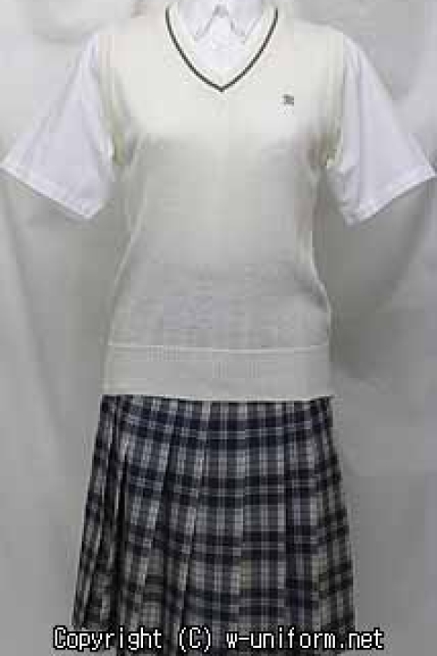 制服は、中学がセーラーで高校がブレザースタイルです。また、2001年の共学化を期に中高とも夏服が新デザインに変更。高校の夏制服は、ボタンダウンの半袖ブラウスに、モノトーン系のチェックスカートを組み合わせ、胸元には特に何も付けません。また、ニットベスト首廻りのVラインが印象的です。シンプルなデザインですが、上品さを演出しています。