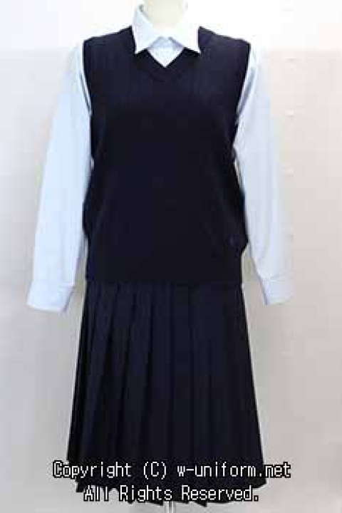 制服は、2008年度の完全中高一貫制導入を期に、中学が同じセーラーのままで、高校が新しいデザインのブレザースタイルになりました。こちらの制服は、新型です。新型の中間服は長袖ブラウスにプリーツスカートとニットベストを組み合わせ胸元には特に何も付けません。