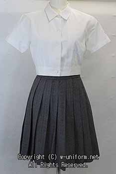 夏制服は、ウエストを細く絞られた白いオーバーブラウスにグレー系のチェックスカートを組み合わせます。ブラウスの左袖には校名の刺繍が入っています。