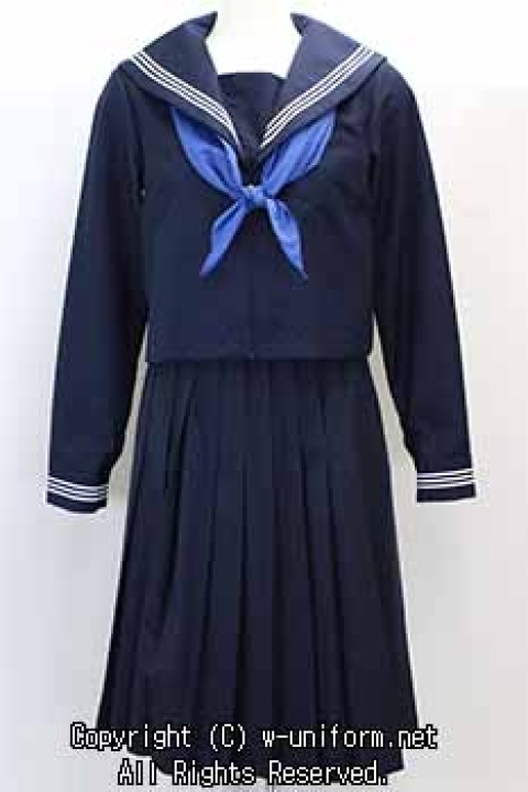 制服は、いままで買取ったハンパ物を組み合わせたセットで、白い3本ラインの入った紺の前開きセーラー服に紺のプリーツスカートの組み合わせ、胸元には青いスカーフを結んでいます。