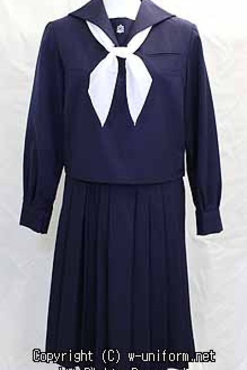 制服は、いままで買取ったハンパ物を組み合わせたセットで、ラインの入っていない紺のセーラー服には胸当てと襟背面両角に刺繍が入っています。胸元には白のスカーフを結んでいます。
