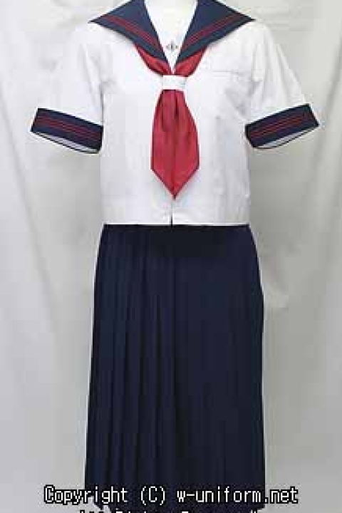 制服は、いままで買取ったハンパ物の制服を組み合わせたセットで、明るめの紺襟に赤い3本ラインと刺繍の入った白いセーラーに、明るい紺のプリーツスカートの組み合わせです。胸元には赤いスカーフを結んでいます。