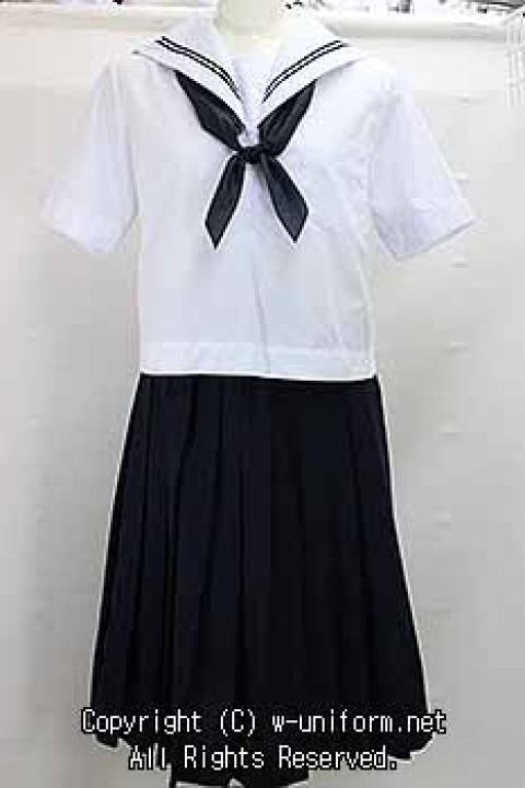 制服は、いままで買取ったハンパ物を組み合わせたセットで、襟に黒色の2本ラインの入った白の横開きセーラー服に紺のプリーツスカートを組み合わせ、胸元には黒色のスカーフを結んでいます。
