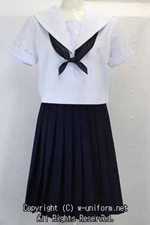 制服は、いままで買取ったハンパ物を組み合わせたセットで、襟と袖口と胸当てと左胸に白色の3本ラインの入った白の横開きセーラー服に紺のプリーツスカートを組み合わせ、胸元には黒色のスカーフを結んでいます。
