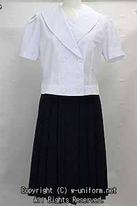 制服は、丸みのあるセーラー襟の白いオーバーブラウスに紺のプリーツスカートを組み合わせています。