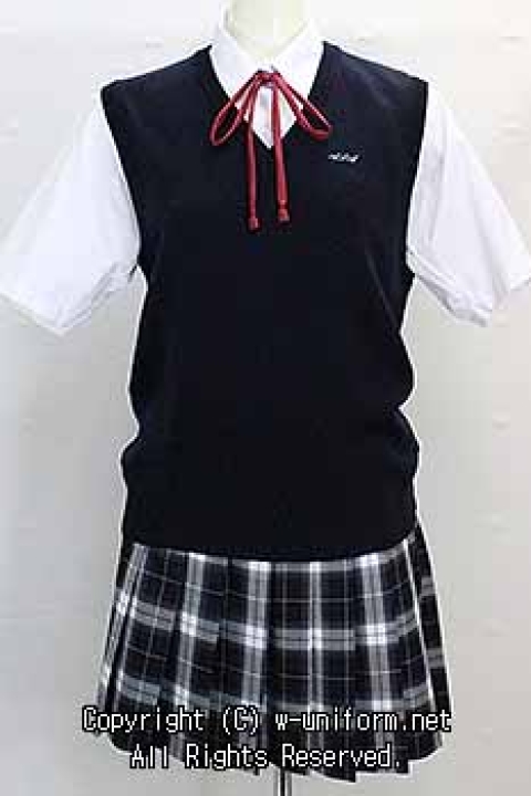 制服は、白い半袖ブラウスに紺色のニットベストとチェックスカートの組み合わせで、胸元には赤のヒモタイを付けています。