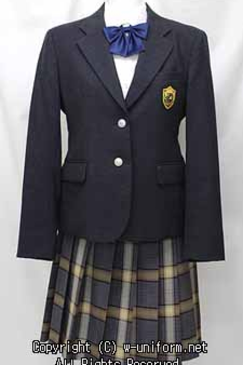 制服は、チャコールグレーの2つボタンのシングルブレザーにチェックスカートの組み合わせで、胸元にはストライプのリボンを付けます。ブレザー左胸には豪華なエンブレムが映えます。
