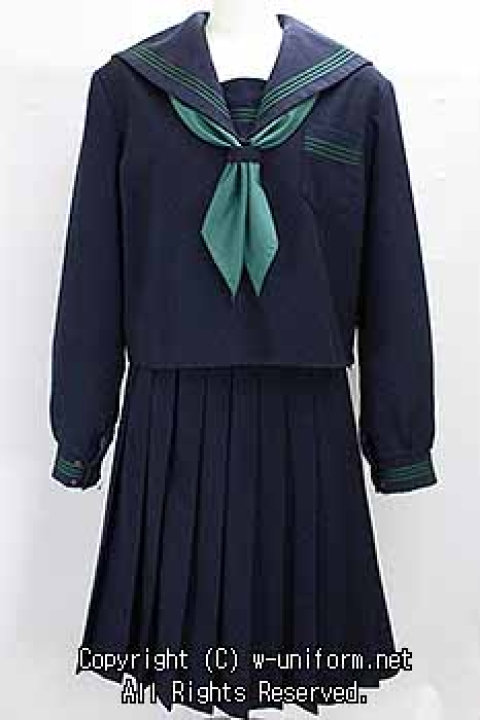 冬制服は、襟と袖口と左胸と胸当てに緑の3本ラインが入った紺のセーラー服です。胸には緑のスカーフをスカーフ留めに通します。