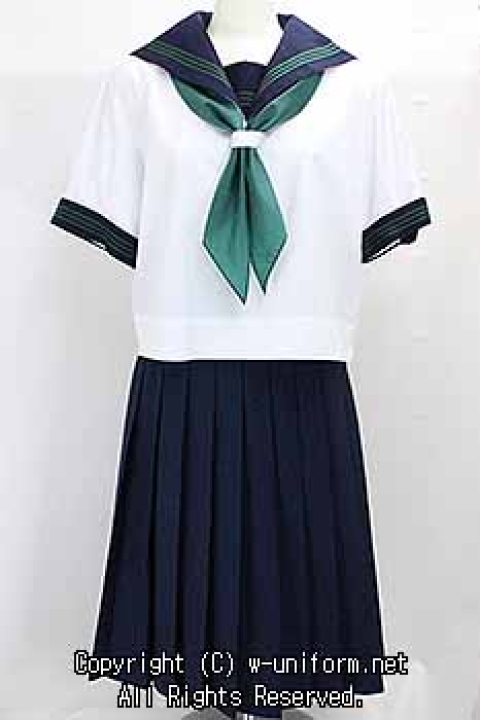 夏制服は、襟と袖口と胸当てに緑の3本ラインが入った白のセーラー服です。胸には緑のスカーフをスカーフ留めに通します。また、セーラーの襟とカフスと胸当ては取り外しができます。