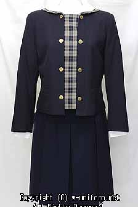 制服は、世界的にも有名なデザイナー、コシノヒロコさんデザインによるもの。デザイン変更当初から、岡山県ではお洒落でかわいい制服の学校として定評がありました。冬服は、細身のショート丈ブレザースタイルですが、セーラーのように大きな三角襟と正面中央にあしらったチェック柄がとても印象的。また、ブラウスもセーラーのような三角襟で外側背面に出し、ブレザーの襟と重ね合わせます(背面の三角襟に入った刺繍もワンポイント)。スカートは、ボックスタイプで、正装用の紺と、副装用のチェック柄があり、違ったバリエーションが楽しめます。遊び心があって、細部にまでデザイナーの思いが存分に受け取れる、大変個性的な制服です。