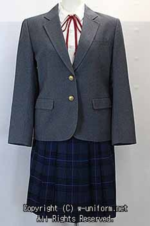 制服は、シングルのグレー色のブレザーに青系色のチェックスカートを組み合わせ、胸元にはエンジ色のネクタイを付けます(こちらの制服にはエンジ色のヒモタイを付けています)。