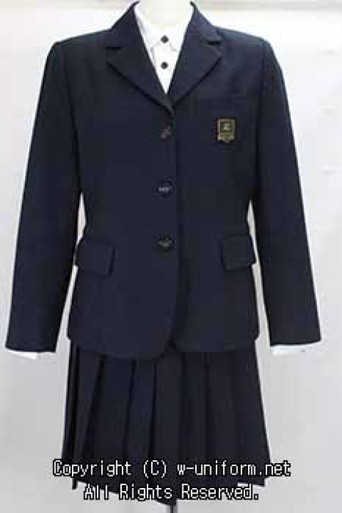 制服は、2020年度から新スタイルに変更されました。こちらの制服は旧型になります。旧冬服は、宮本由利子さんデザインで、黒っぽい濃紺シングルブレザーに同色のプリーツスカートを組み合わせ、胸元にはブラウスの黒ボタンが映えるため特に何も付けません。またブレザーとスカートには個性的な薄い縦ストライプが入っています。
