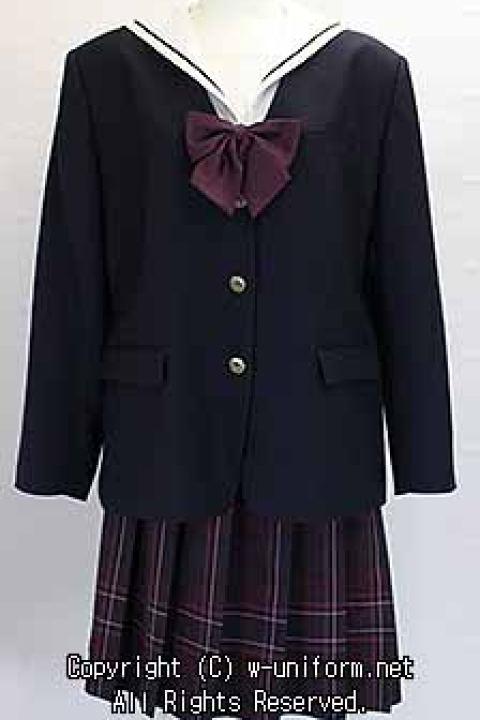 制服は、セーラーブラウスの襟を紺のイートンジャケットから外に出し、エンジ色ベースのチェックスカートと組み合わせ、エンジ色のリボンを胸元にフックで付けます。オプションが豊富で何通りもの組み合わせができます。またエンジ色のセーターも付属しています。地元ではかわいいと評判の人気の制服です。
