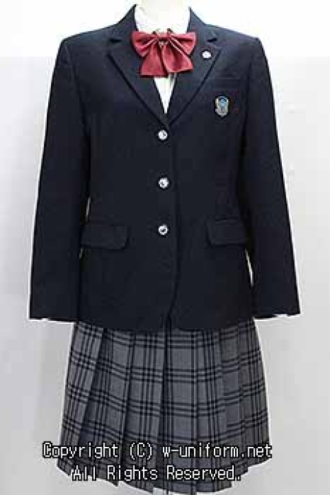 制服は、左胸にエンブレムのある紺のシングルブレザーに、チェックスカートを組み合わせ、胸元には赤色か青色のリボンを付けます(こちらの制服には赤色リボンを付けています)。またブレザーには薄い縦ストライプ柄が入っています。