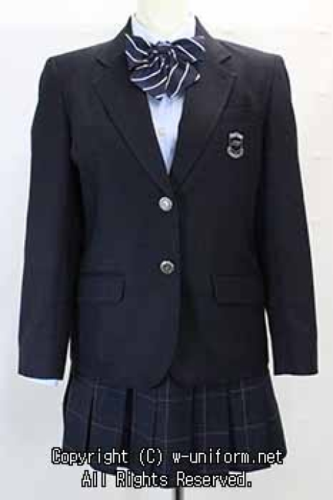制服は、左胸にエンブレムの付いた紺のシングルブレザーに青いブラウス、紺系のチェック柄スカートを組み合わせています。胸元にはストライプ柄のリボンを付けています。