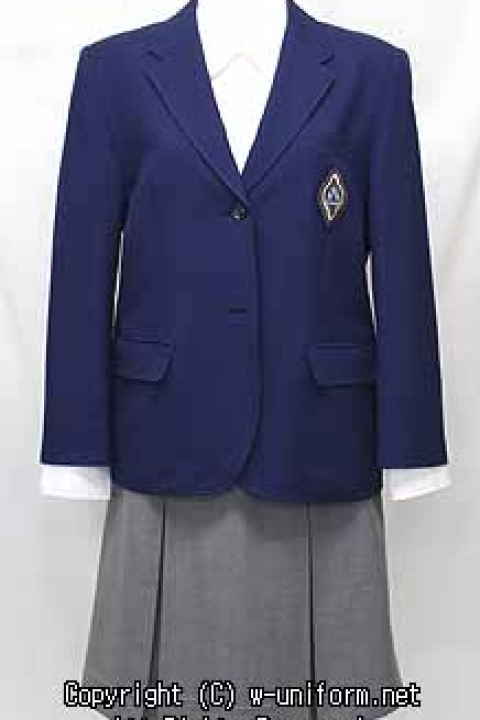 制服は、1963年に制定。現在の制服は、宮本由利子さんデザイン。冬服は、中高同じ明るめの紺色シングルブレザーにグレーのボックススカートという清楚な制服です。首元にリボン等は付きませんが、ブラウスの首元に刺繍が入っており、アクセントとなっています。(現在の制服は2003年より一部変更、スカートがボックスプリーツに、また、ブレザー、ブラウスも多少のデザイン変更されています。)シンプルながらも、デザイナーのセンスが際立つお洒落な制服です。