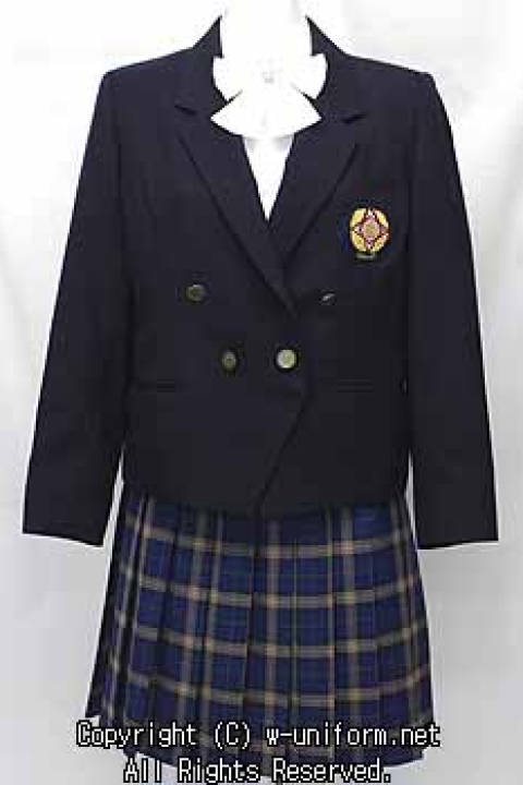 制服は、1993年度から共学になるのにともない、女子の制服として新しく制定されました。冬服は、紺のダブルのブレザーに、シックな色使いのグレー系チェックスカートの組合せで、胸元にあしらった白い大きなリボンが清潔感を感じさせる、品の良い制服です。